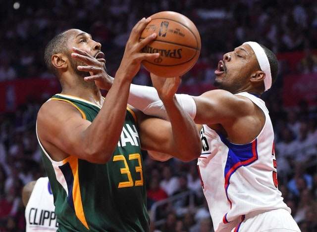 Clippers forward Paul Pierce (34) fouls Utah Jazz center Boris Diaw