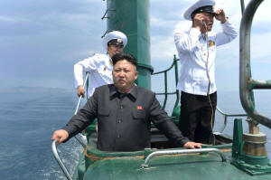 Kim Jong Un stands on the conning tower of a submarine during his