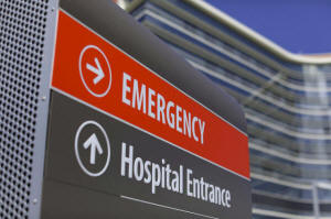 An emergency sign points to the entrance to Scripps Memorial
