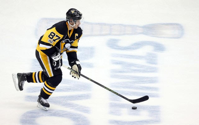 Penguins center Sidney Crosby (87) warms up before playing the