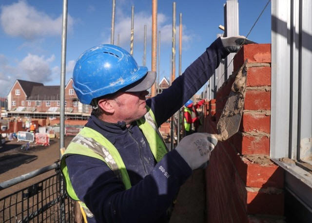 A bricklayer working for Taylor Wimpey builds a wall on