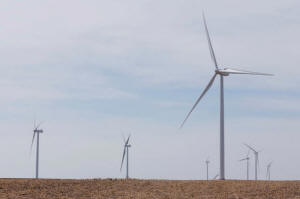 Wind turbines stand above the plains north of Amarillo, Texas, U.S.,