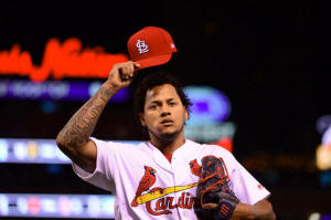 Cardinals starting pitcher Carlos Martinez (18) salutes the fans