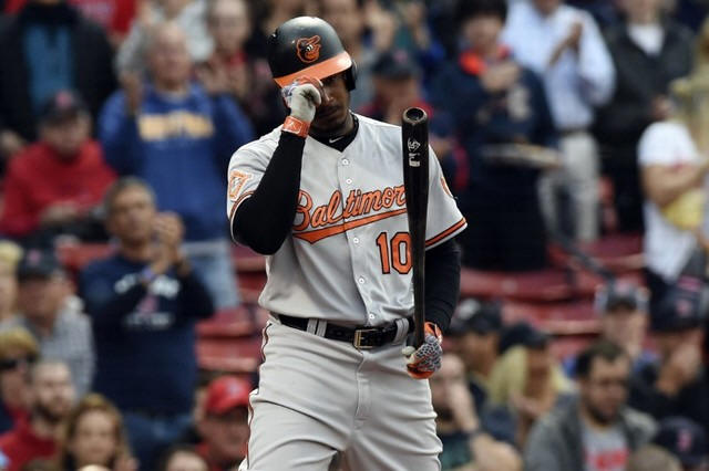Baltimore Orioles center fielder Adam Jones (10) tips his helmet