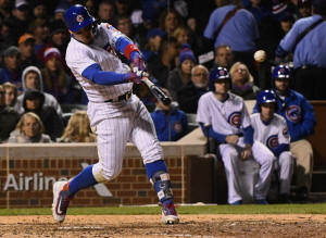 Cubs second baseman Javier Baez (9) hits a two RBI triple in the