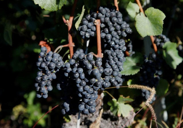 Red grapes are pictured before their harvest in a vineyard near Leuk,