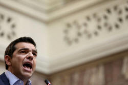 Greek Prime Minister Alexis Tsipras addresses his lawmakers during a