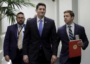 Speaker of the House Paul Ryan smiles as he departs a meeting at the