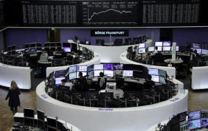 Traders work in front of the German share price index, DAX board, at