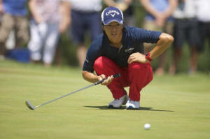 Ryo Ishikawa checks out the green before a putt on the 2nd hole in