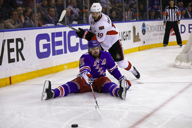 Rangers left wing Rick Nash (61) passes the puck in front of Ottawa