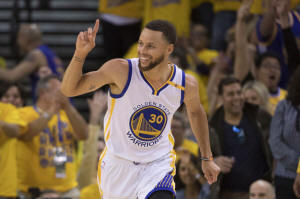 Warriors guard Stephen Curry (30) celebrates against the Utah Jazz