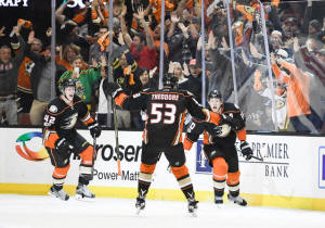 Ducks celebrate after the game winning goal by right wing Corey