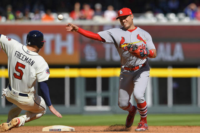 Cardinals shortstop Aledmys Diaz (36) turns a double play over
