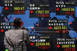 of various countries outside a brokerage in Tokyo, Japan, November
