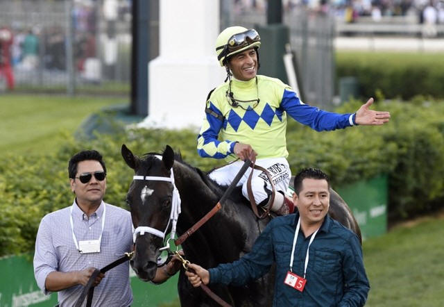 John Velazquez aboard Always Dreaming (5) celebrates after winning