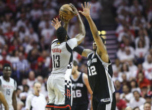 Harden, bench help Rockets even series with Spurs
