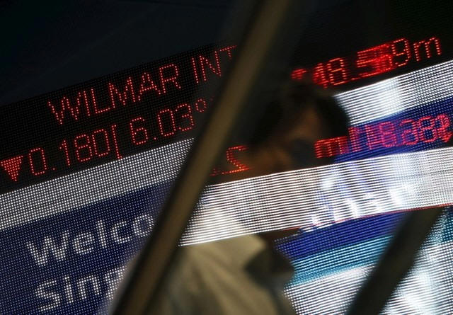 A man passes a stock index board showing Wilmar International losing