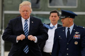 President Donald Trump (L) arrives to board Air Force One for travel to