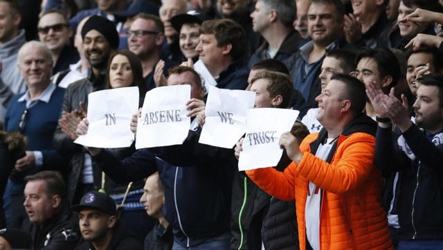 Tottenham fans hold up banners for Arsenal manager Arsene Wenger