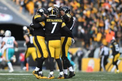 Ben Roethlisberger (7) celebrates with teammates after a touchdown
