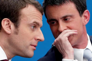 Manuel Valls (R) speaks with then Economy minister Emmanuel Macron