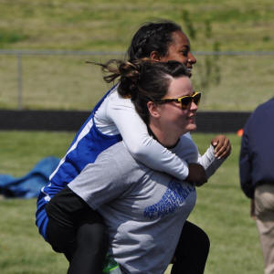 qualifier Konjit Mott a piggy-back ride following her 400m run.