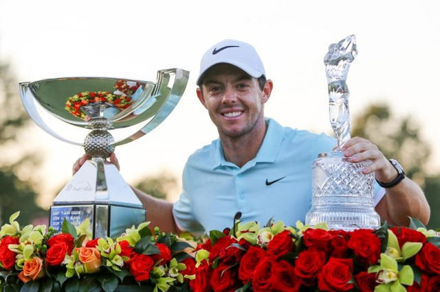 Rory McIlroy celebrates with the FedEx Cup Trophy and the Tour