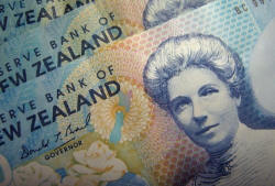 Reserve Bank of New Zealand dollar notes are pictured in Singapore
