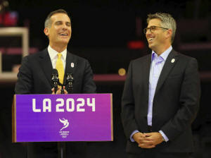 Los Angeles Mayor Eric Garcetti laughs with LA 2024 Chairman Casey