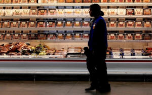 A employee walks by a meat cooler in the grocery section of a Sam's