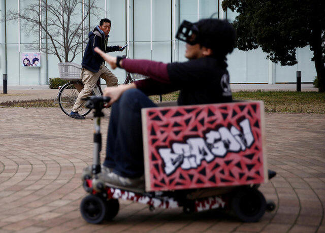 A passer-by looks at a "Hado Kart" player during the sport's