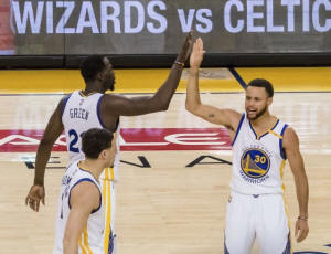 Warriors forward Draymond Green (23) high fives guard Stephen Curry