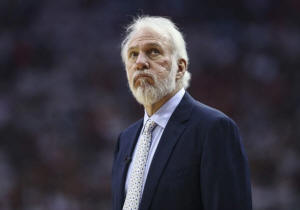 Spurs head coach Gregg Popovich looks up during the second quarter
