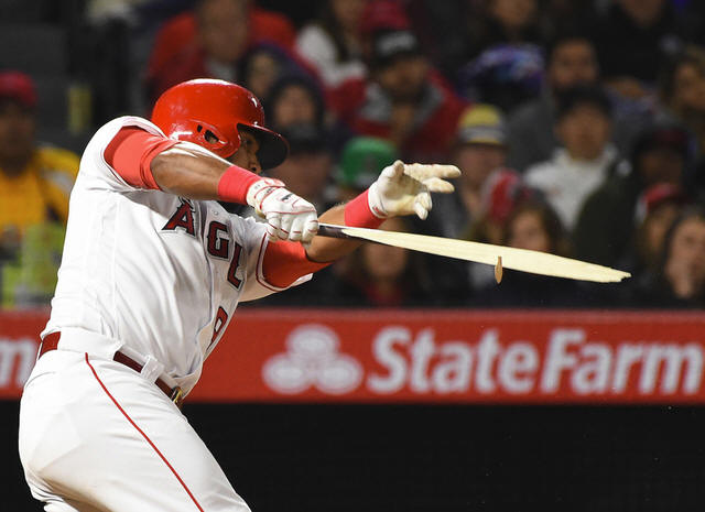 Angels first baseman Luis Valbuena (18) breaks his bat in the fourth