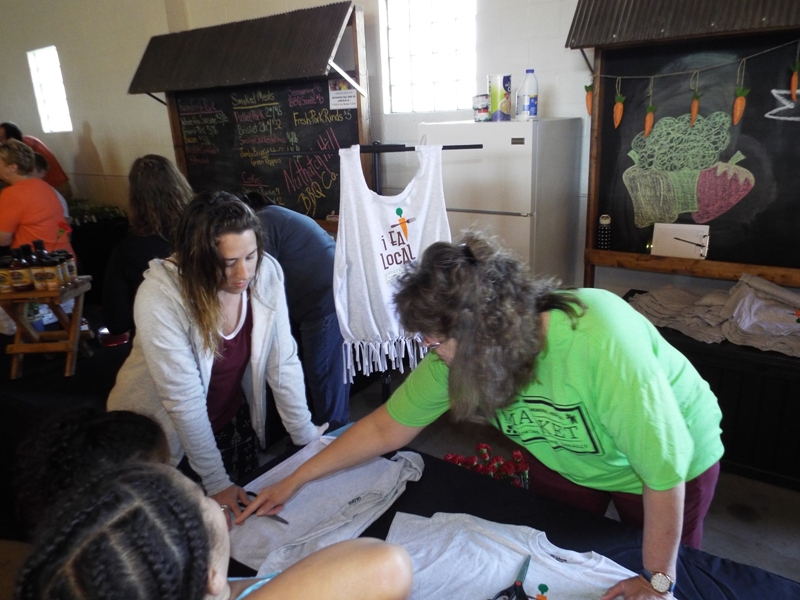 At the Power of Produce, kids had the opportunity to make a cool summer time tee-shirt that also came with a promise – “I eat local.” Volunteers guided the kids in cutting up the shirts, turning them into tank-tops, then creating a knotted fringe along the bottom hem.