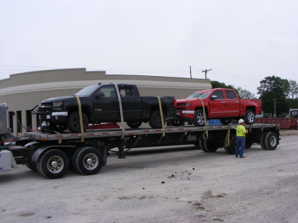 pick-up trucks and SUVs onto flatbed trucks to be hauled away.