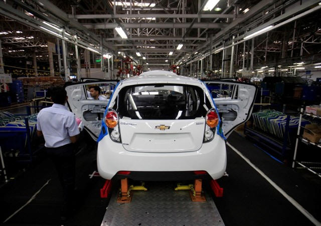 Employees work on a Chevrolet Beat car on an assembly line at the