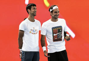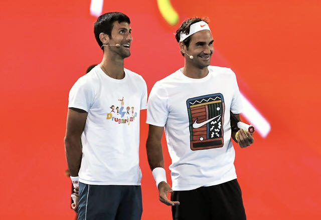 Switzerland's Roger Federer (R) and Serbia's Novak Djokovic react