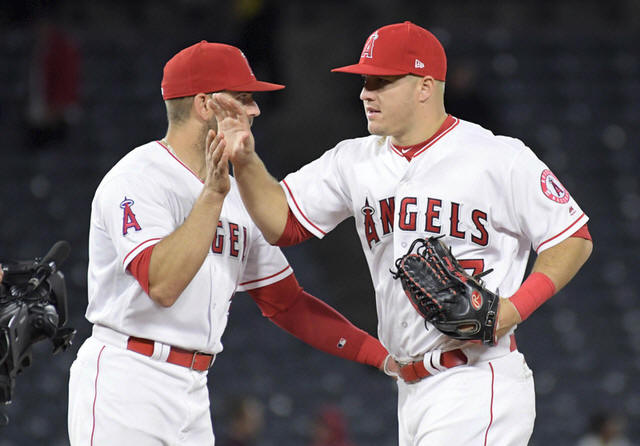 Angels center fielder Mike Trout (27) is congratulated by infielder