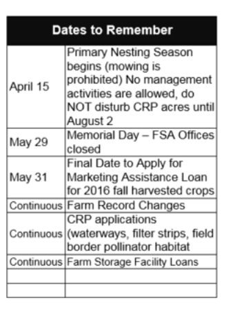 Acreage reporting dates vary by crop and by county so please contact your local FSA office for a list of county-specific deadlines.