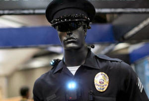 A mannequin dressed as a police officer to show off a body camera