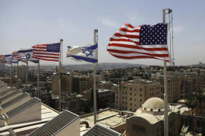 American and Israeli flags flutter in the wind atop the roof of the