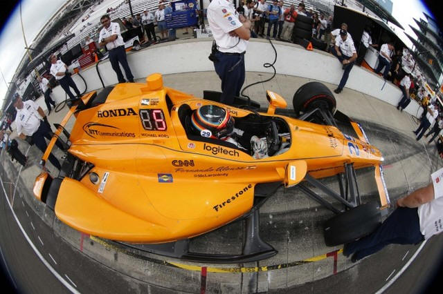 Verizon IndyCar Series driver Fernando Alonso sits in his car in the