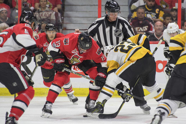 Senators center Derick Brassard (19) faces off against Pittsburgh