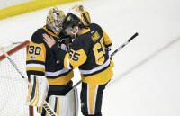 Penguins defenseman Ron Hainsey (65) celebrates with goalie Matt