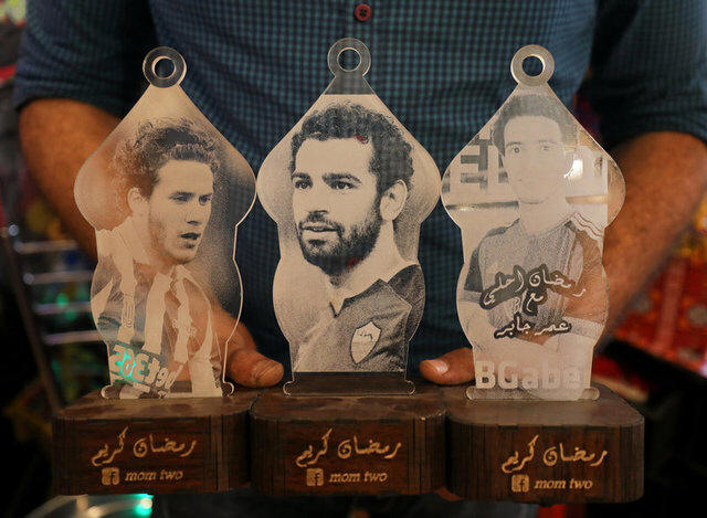 affixes acrylic portraits of Egyptian footballers, pop stars and