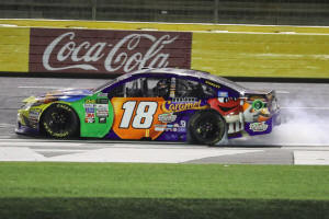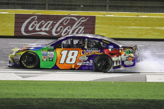Series driver Kyle Busch (18) starts his victory burn out during the