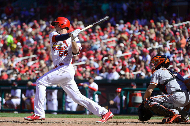 Cardinals pinch hitter Stephen Piscotty (55) hits a single off of