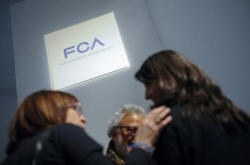 People talk as they stand next to a logo of Fiat Chrysler